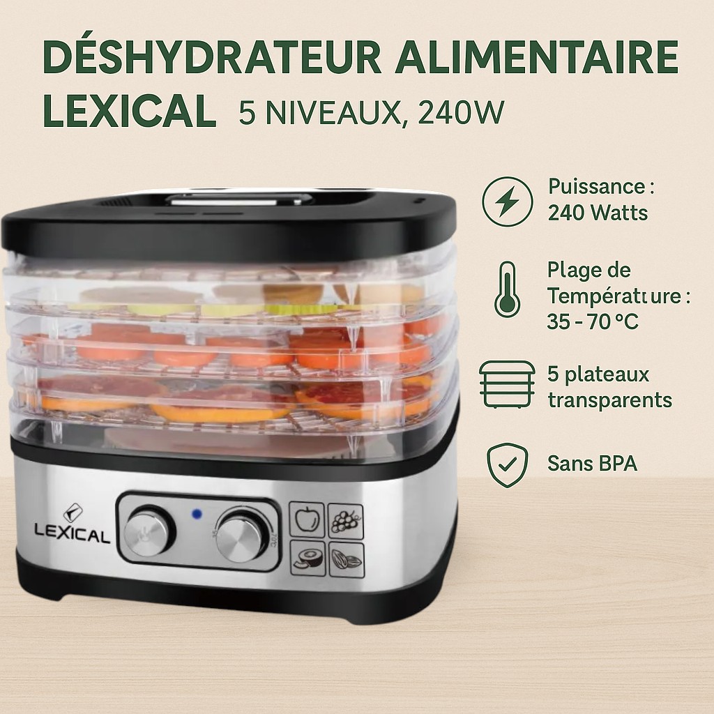 Transformez facilement vos fruits, légumes, viandes et autres ingrédients en délices secs et sains avec le Déshydrateur Alimentaire Électrique Lexical 5 Niveaux. Grâce à ce puissant appareil de 240W et sa conception ingénieuse, vos snacks faits maison sont plus savoureux, plus sains et exempts de BPA. Une touche d'élégance pour votre cuisine avec ses finitions noir et argent, il est aussi performant qu'élégant ! 🌱✨